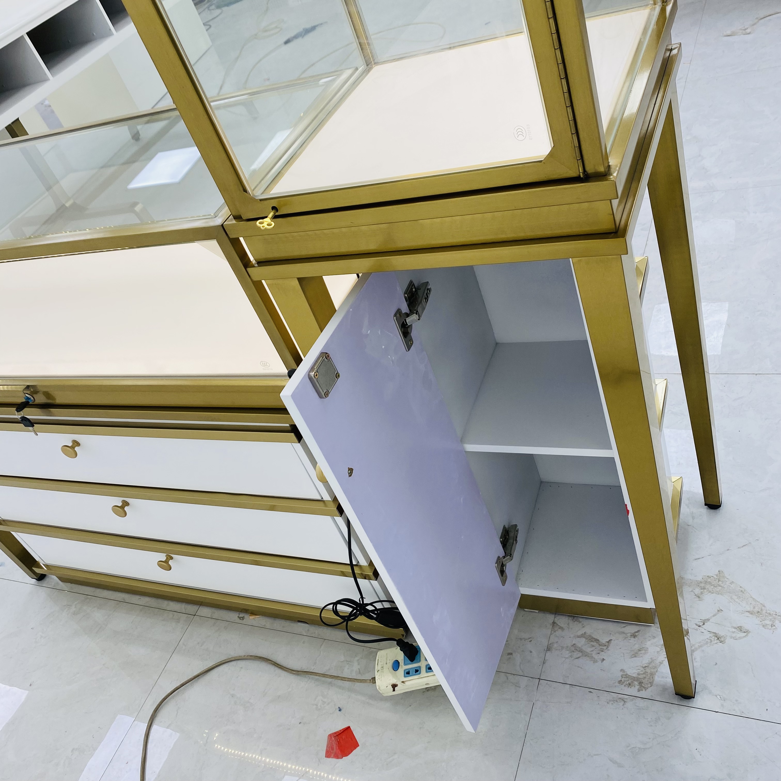 Это индивидуальный стеклянный шкаф с многоуровневыми атрибутами. Он состоит из одного высокого шкафа и одного шкафа низкой высоты. Передний шкаф измеряет L120*W55*H95CM, в то время как вертикальный шкаф измеряет L55*W55*H140cm. Он изготовлен из 8 -миллиметрового прозрачного измеренного стекла, обеспечивая четкий вид на предметы внутри, а также предлагает безопасность. Интерьер облицован белой кожей PU, давая мягкий и элегантный вид. Базовый шкаф имеет трехуровневые ящики, которые предлагают достаточно места для хранения. Базовый шкаф граничит с нержавеющей сталью, улучшая его эстетическую привлекательность и долговечность.
