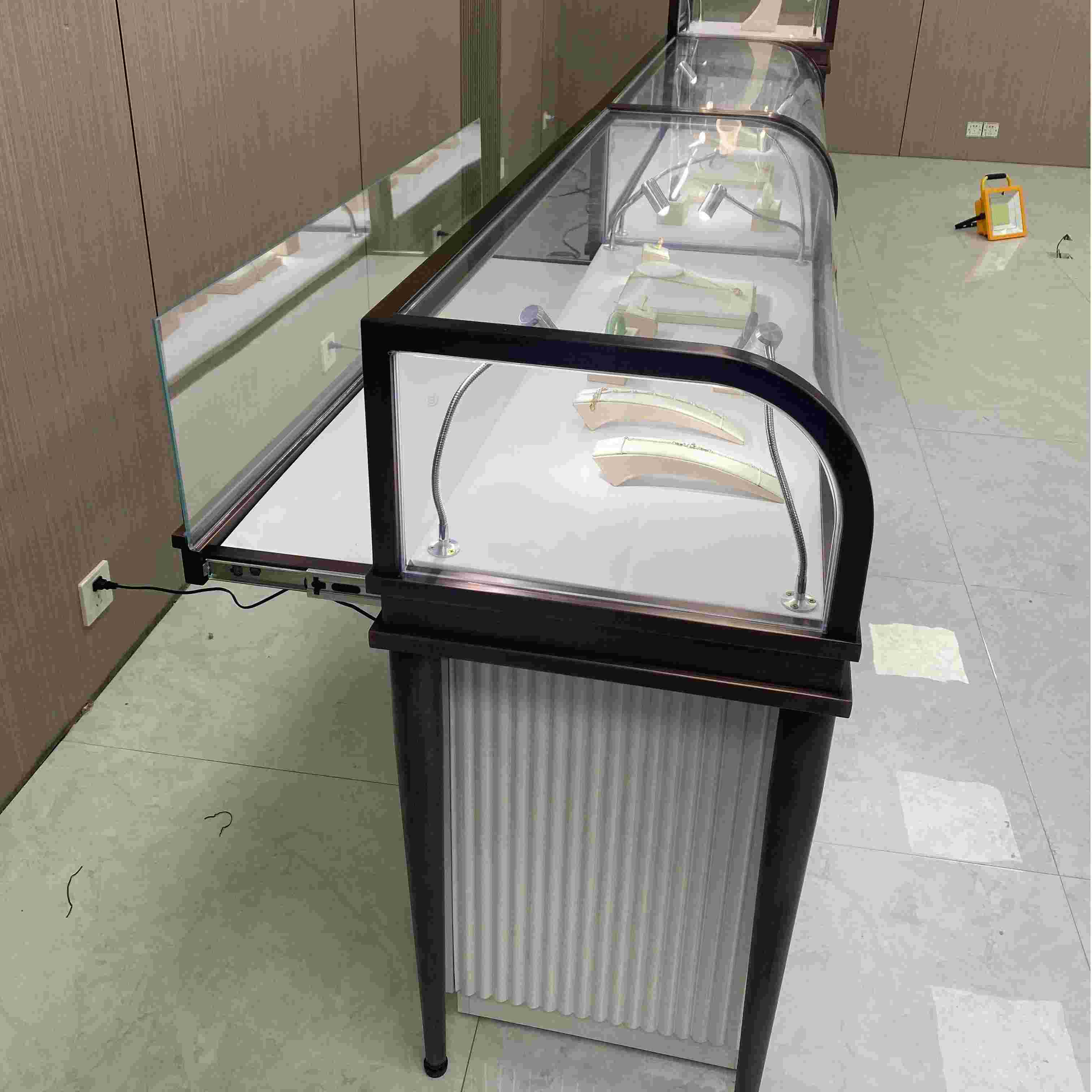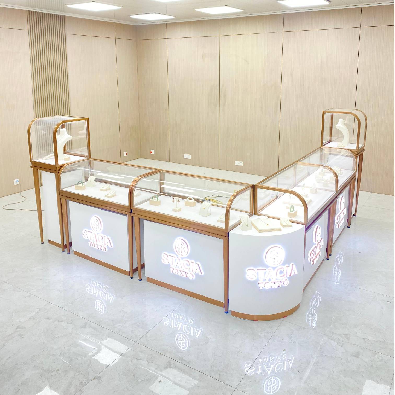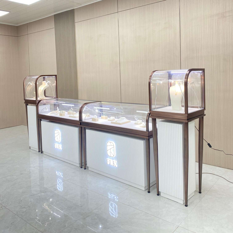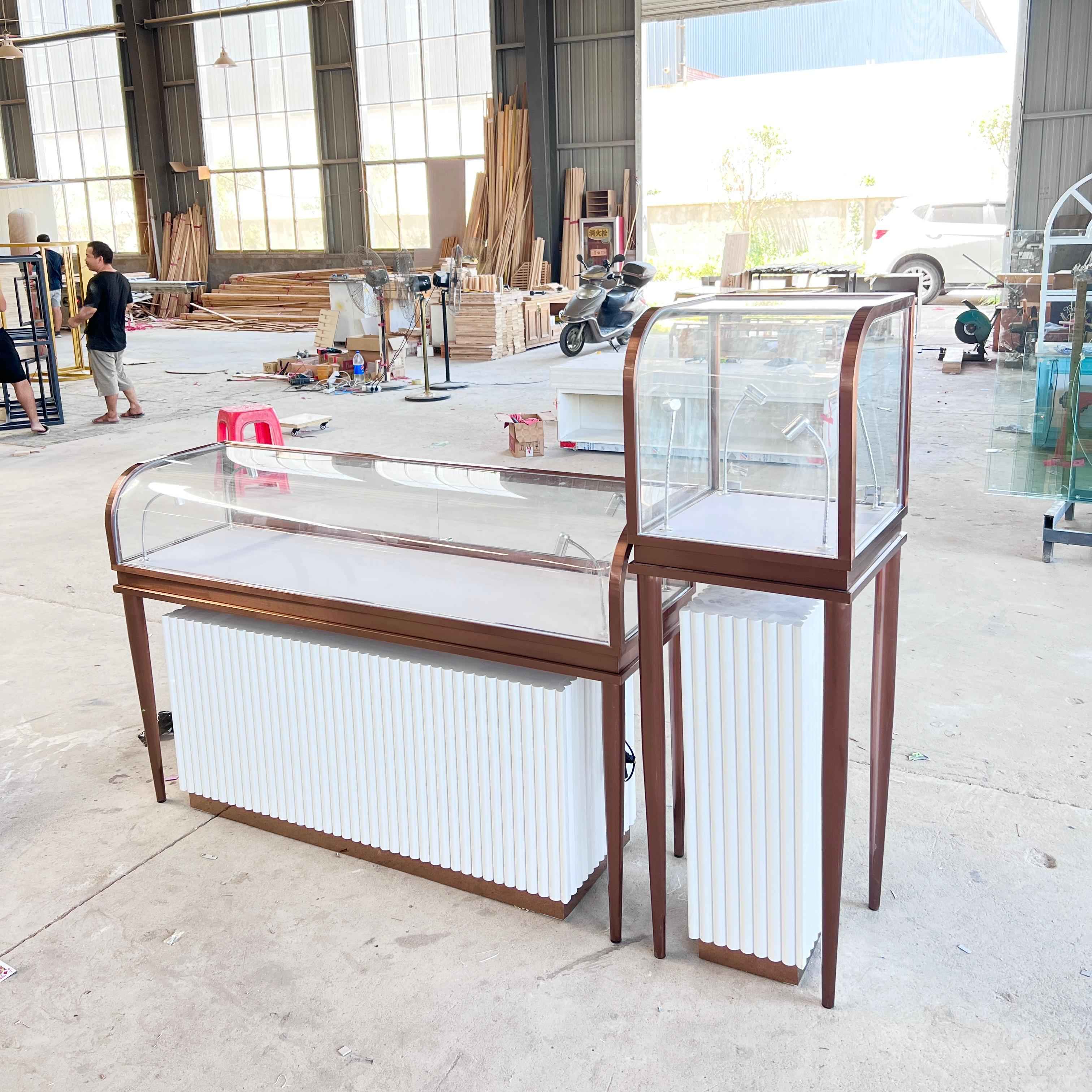 Этот индивидуальный шкаф для демонстрации ювелирных изделий, изготовленный из нержавеющей стали с матовой отделкой из розового золота, излучает элегантность и роскошь. Размер переднего размера - L120*W55*H95CM. В вертикальном размере ISL55*W55*H140CM. Стученное стекло не только добавляет стильный штрих, но также предлагает превосходный вид драгоценностей. Вы можете добавить логотипы, позволяя предприятиям адаптировать его к своему бренду, что является большим преимуществом для оптовых ювелирных фирм, основанных на торговом центре. Нержавеющая сталь обеспечивает долговечность. Визуальная привлекательность оттенка розового золота и изогнутое стекло, привлекающее клиентов. Настройка дополнительно повышает видимость бренда. Вскоре, это идеальный выбор для розничной торговли ювелирными изделиями, которые хотят функциональный, стильный, улучшающий бренд дисплей.