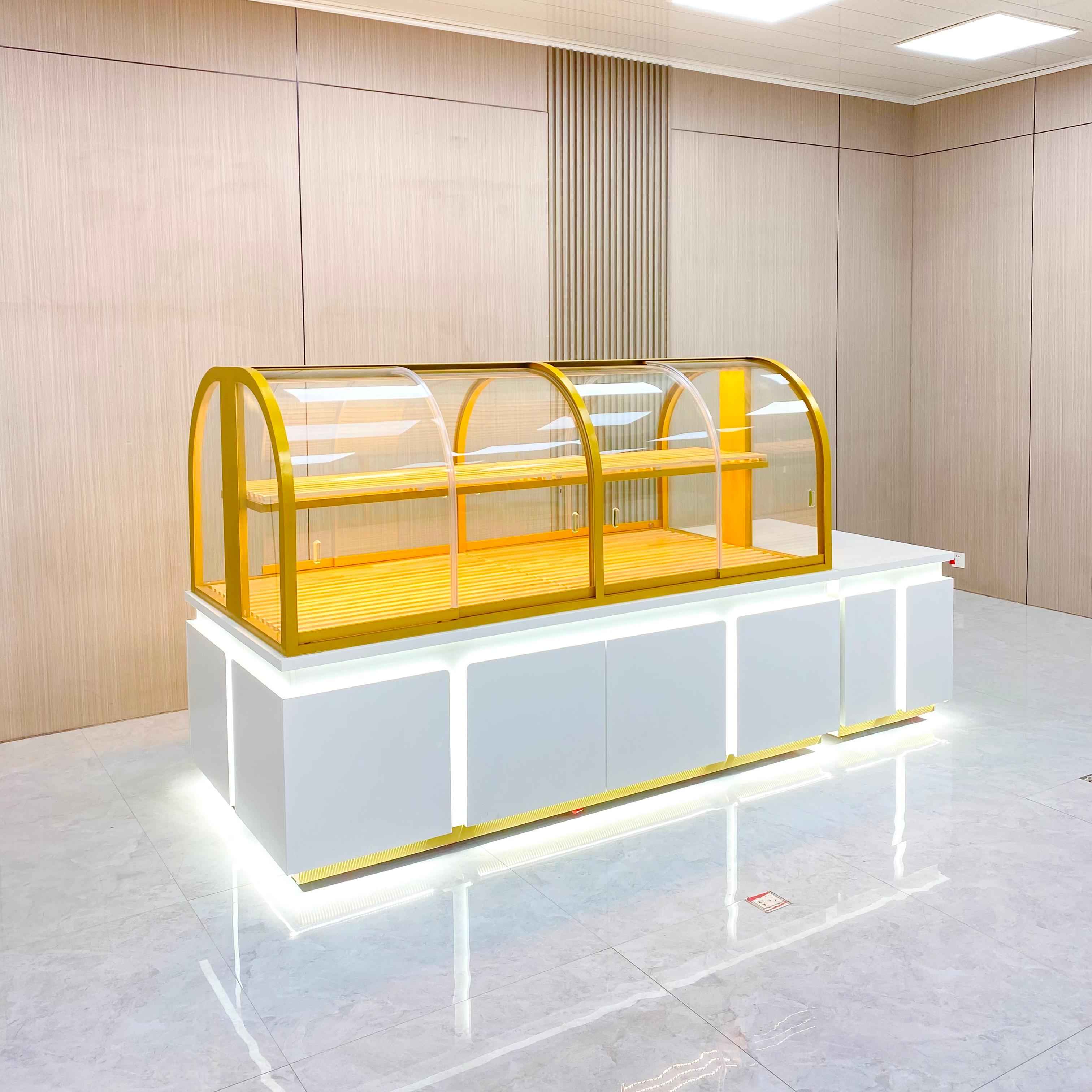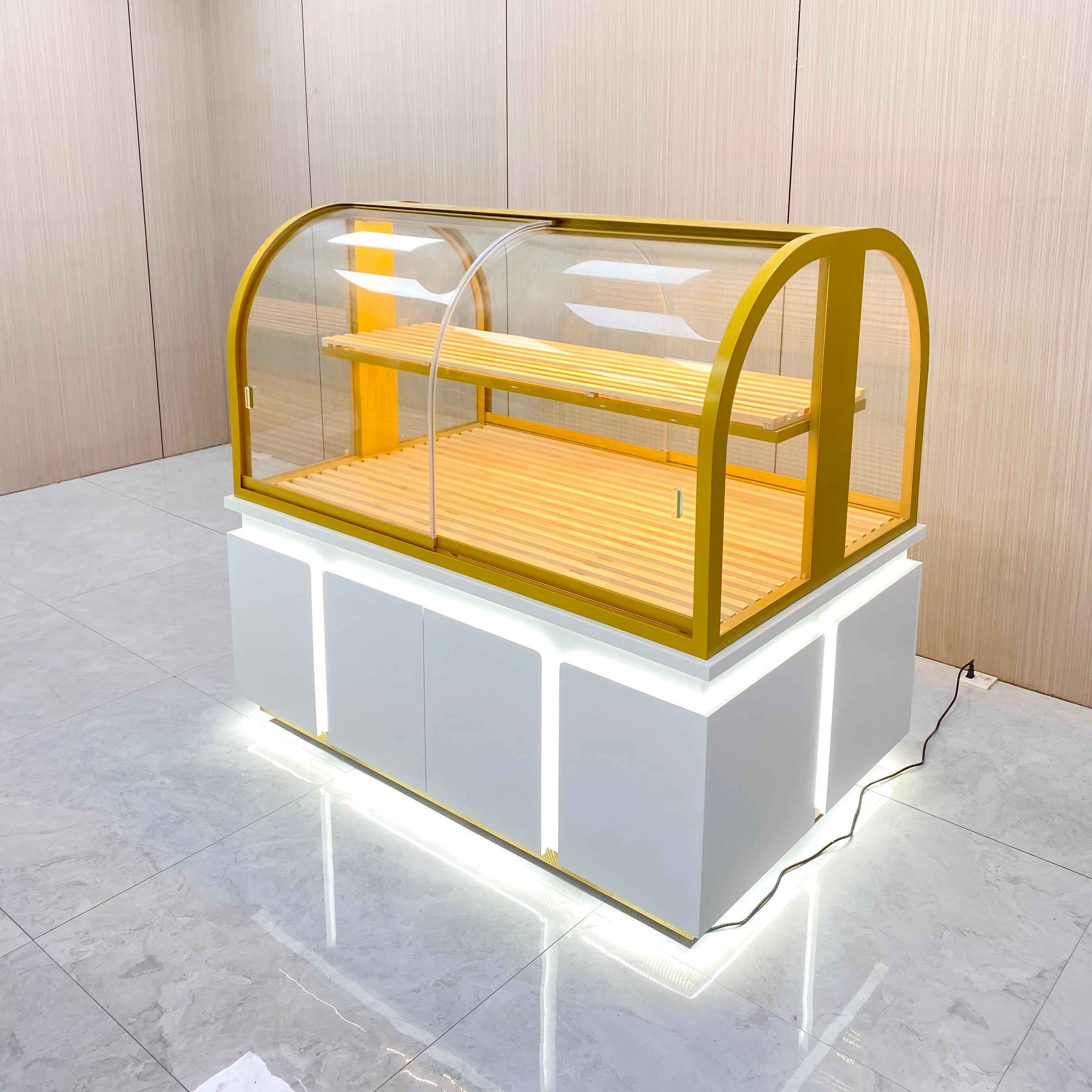 Простая пекарня в стиле - это высококачественный дисплей. Он оснащен рамой из нержавеющей стали, которая обеспечивает долговечность и гладкий внешний вид. Шкаф оснащен прозрачным стаканом 8 мм, обеспечивающим безопасность и четкий вид на предметы внутри. Раздвижные стеклянные двери обеспечивают легкий доступ, сохраняя содержимое свежего и видимым. Базовый шкаф изготовлен из запеченной краски, добавляя к общей эстетике и прочности дисплея. Кроме того, он оснащен светодиодными фонарями, чтобы осветить дисплей, подчеркивая выпечку внутри.