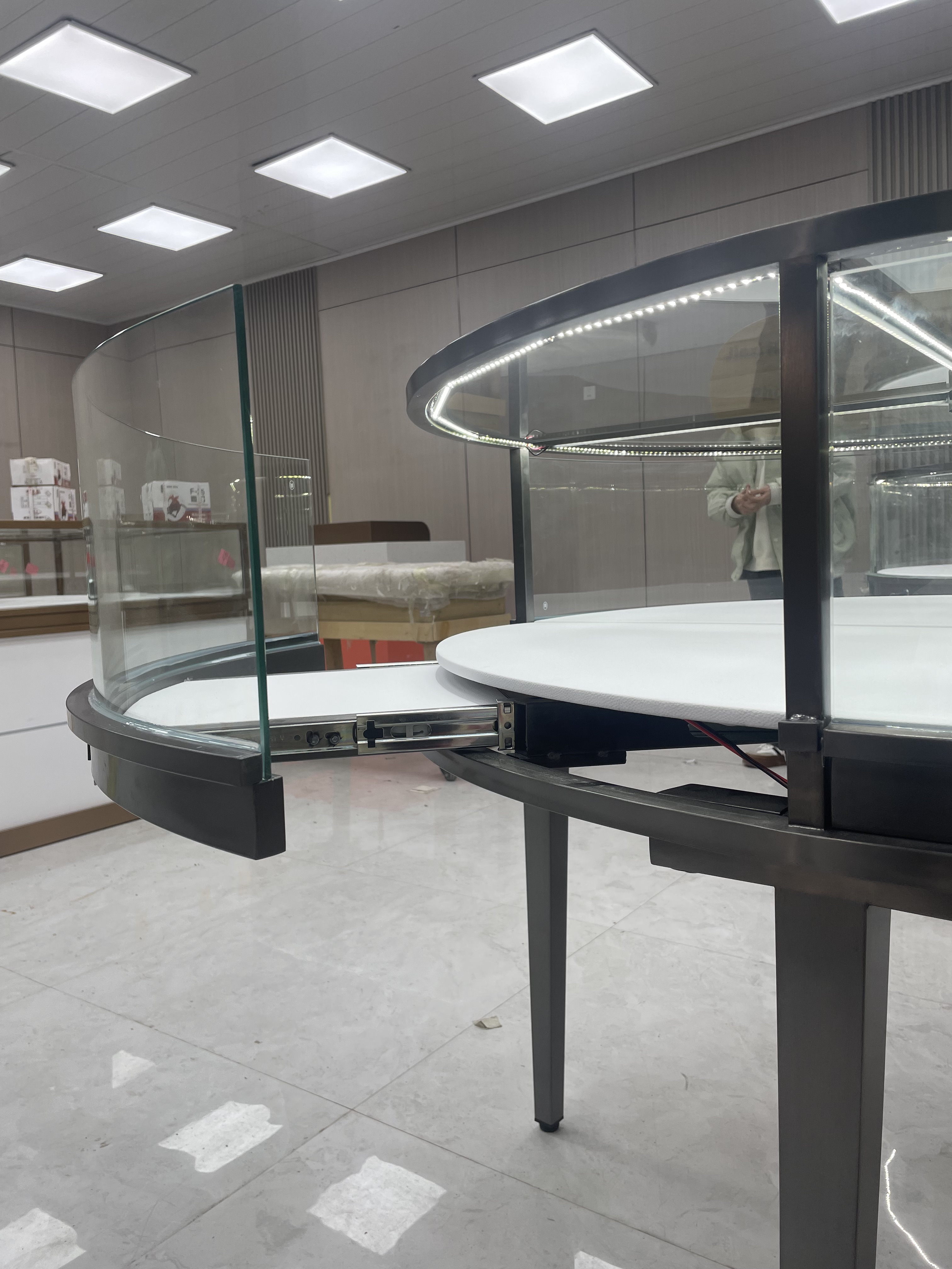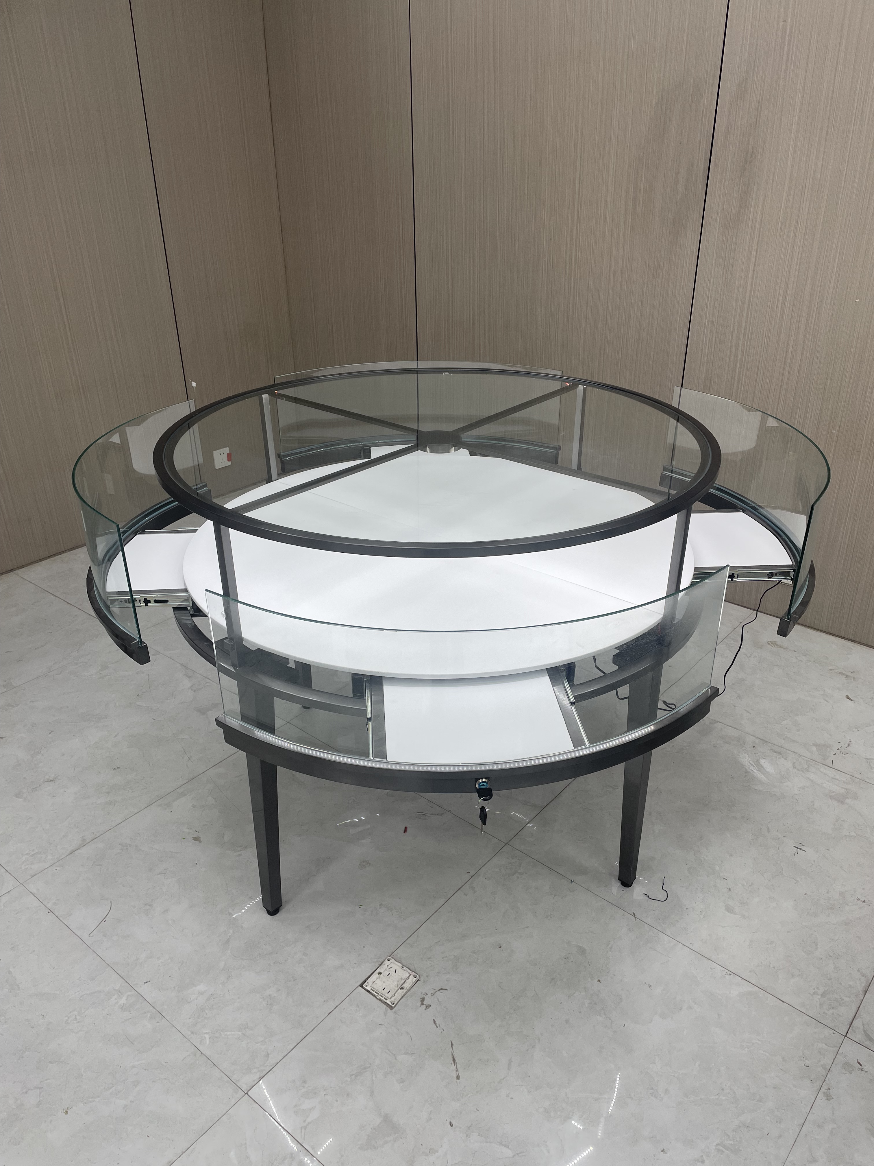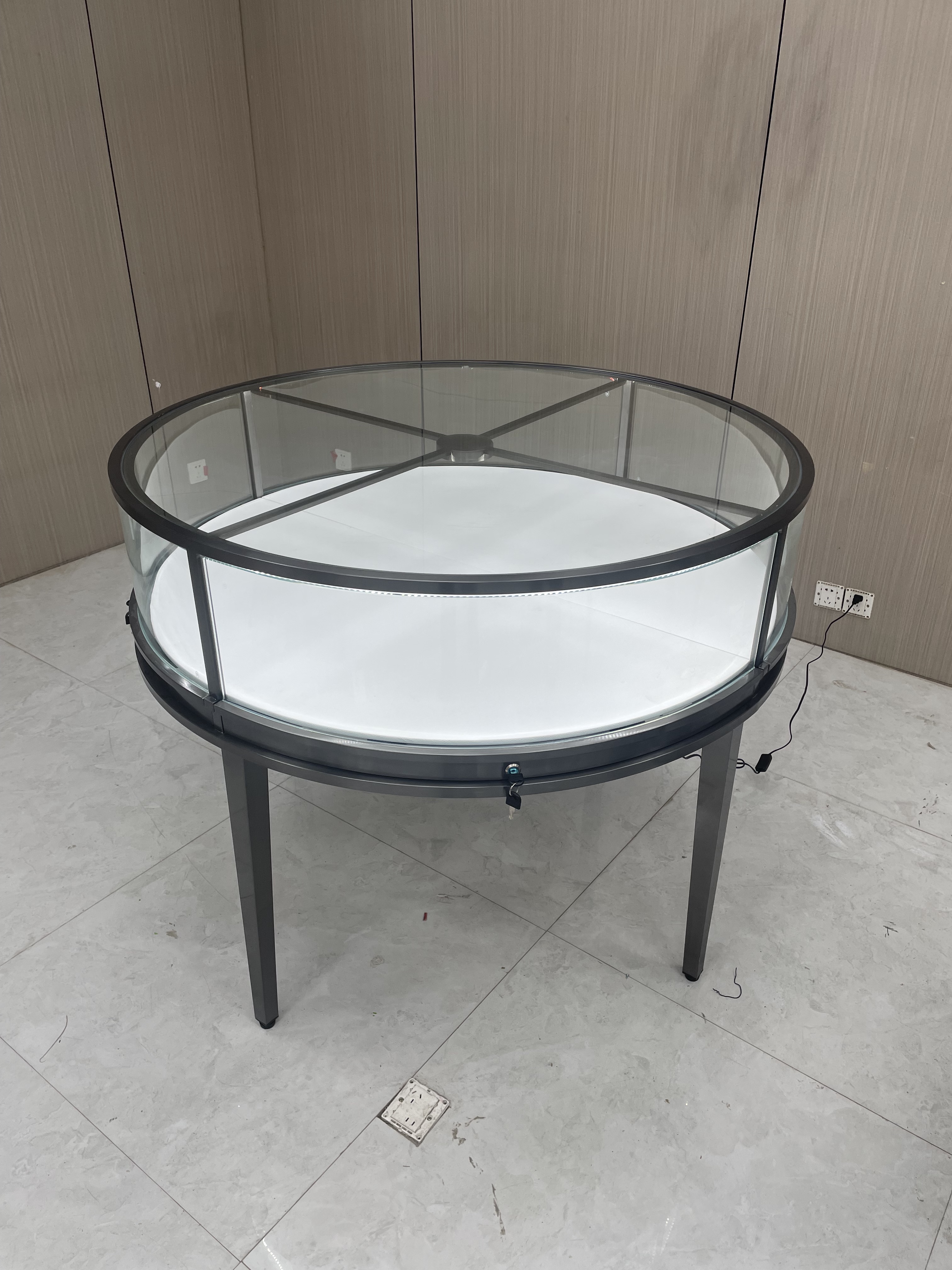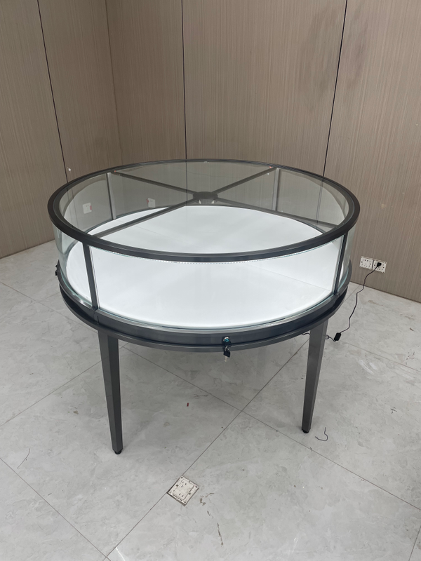 A: Шкаф для дисплея круглый, с размерами 120 см × 120 см × 95 см, предлагая достаточно места для ювелирных изделий, сохраняя при этом элегантный и компактный внешний вид.