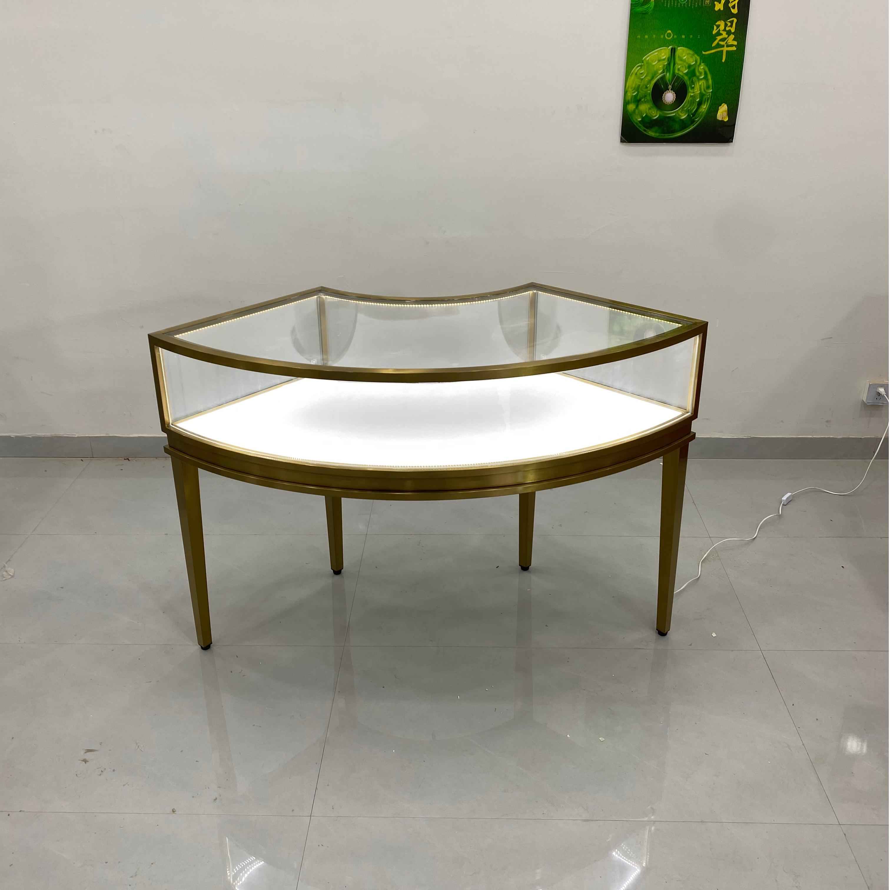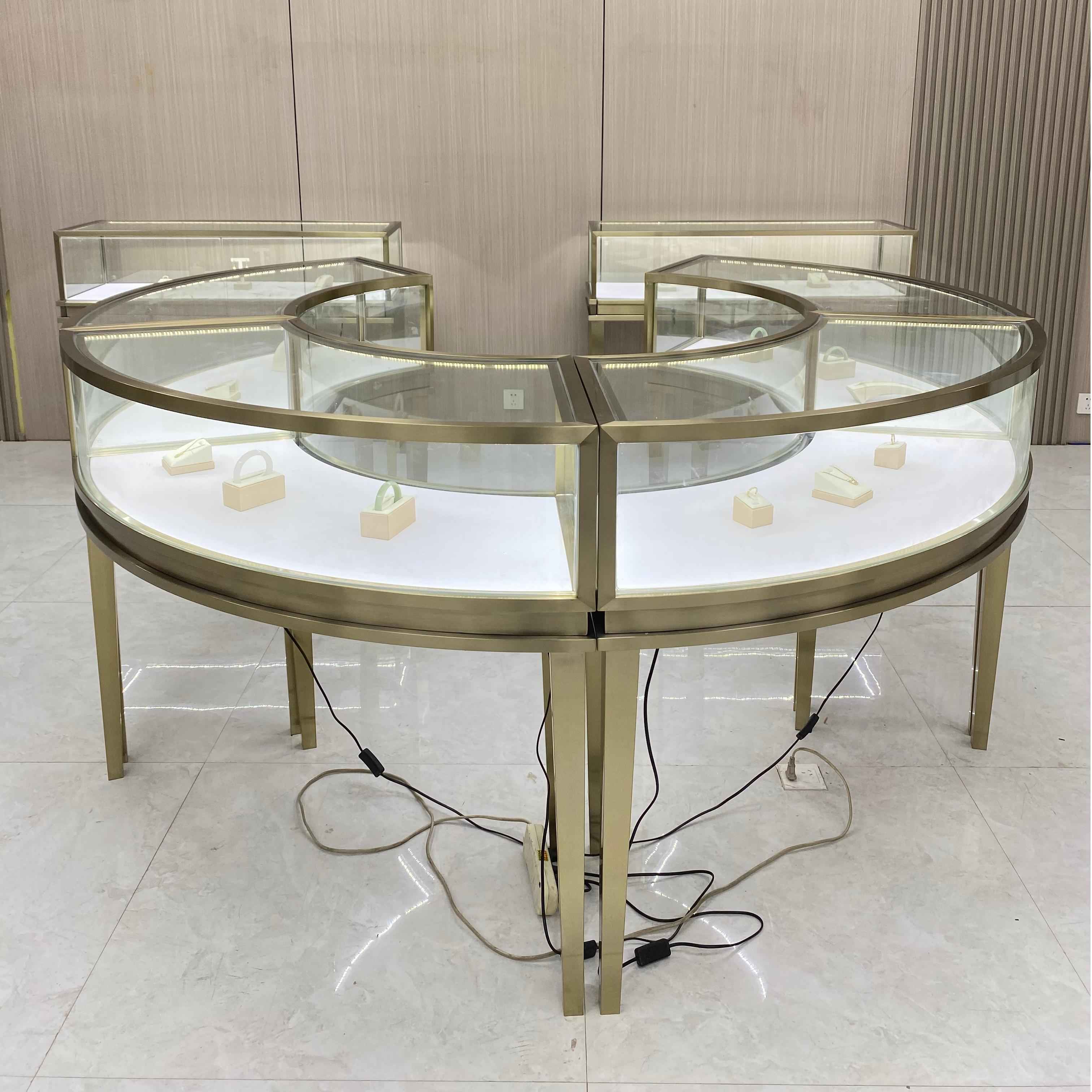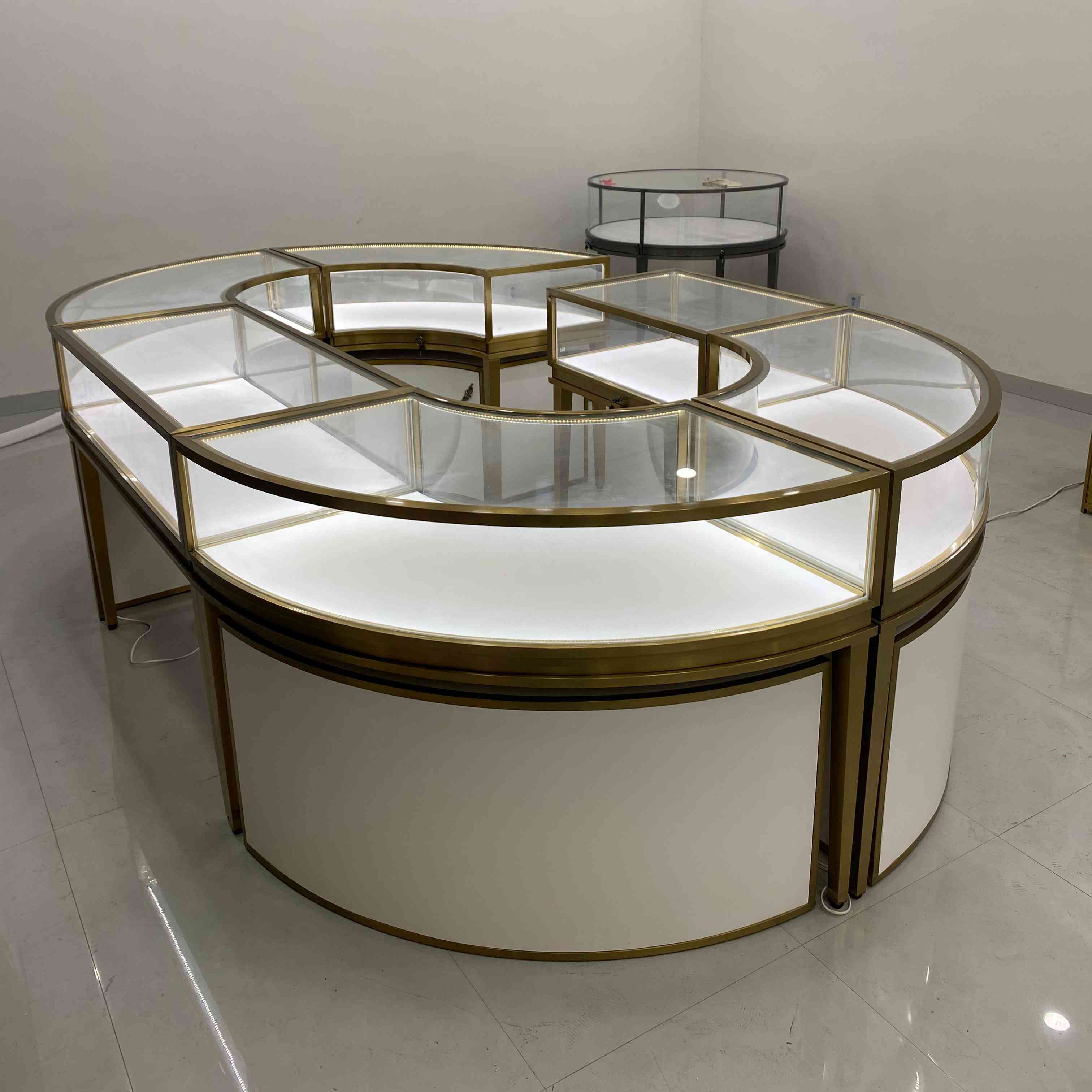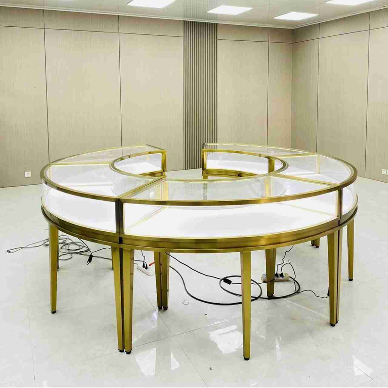 Это стеклянный шкаф для ювелирных изделий с высококачественными функциями. Каждый шкаф имеет размеры L150*W45*H95CM. Это набор шкафов в форме фанатов, которые предлагают большую гибкость в расположении. Их можно объединить, чтобы сформировать круг, эллипс или S-образную форму в соответствии с вашими предпочтениями. Шкафы изготовлены из нержавеющей стали с матовой отделкой, и они доступны в различных цветах, таких как титановое золото, золото шампанского и розовое золото. Интерьер облицован белой кожей PU, обеспечивая мягкий и элегантный фон для ювелирных изделий. Базовые шкафы белые, дополняющие общую эстетику дисплея.