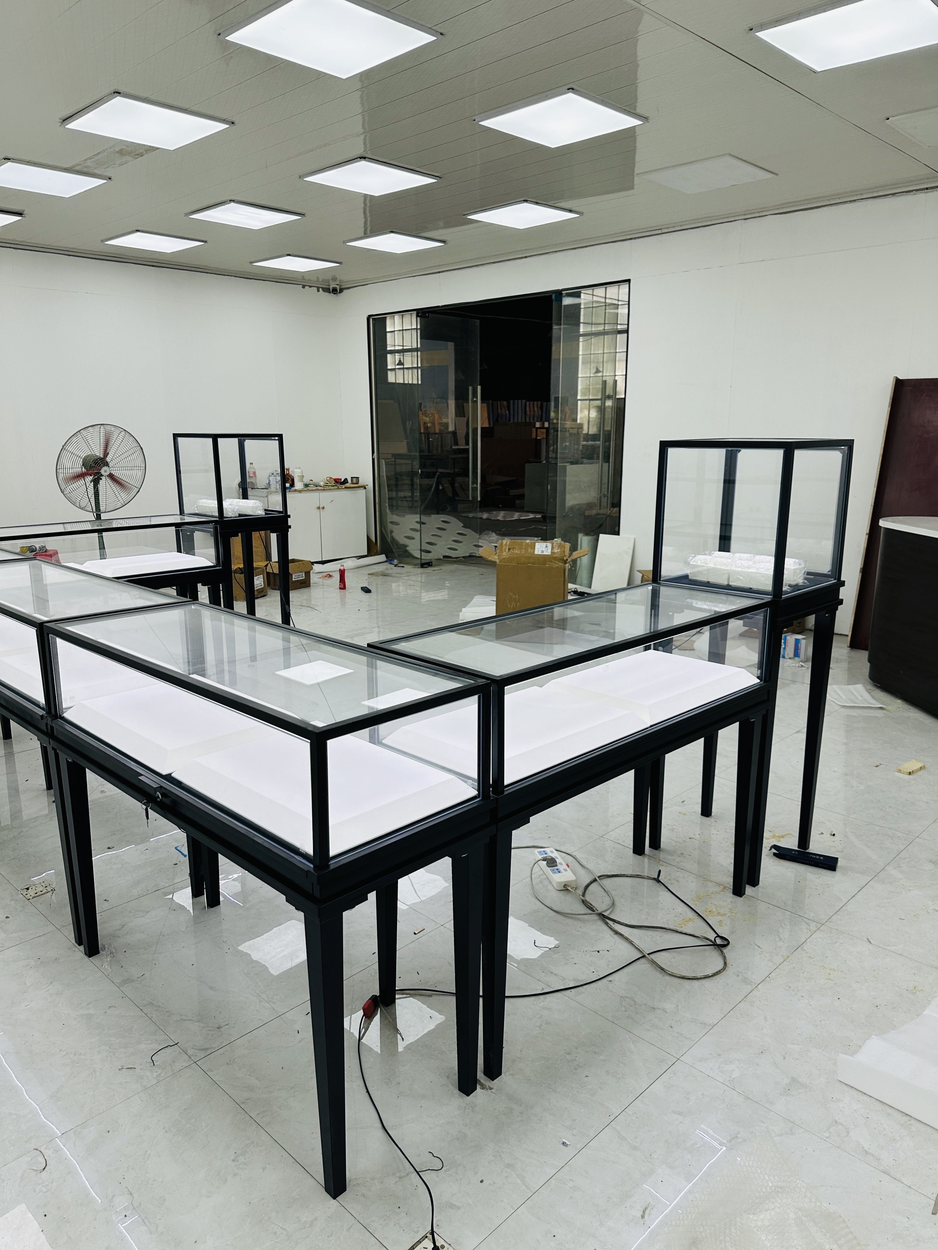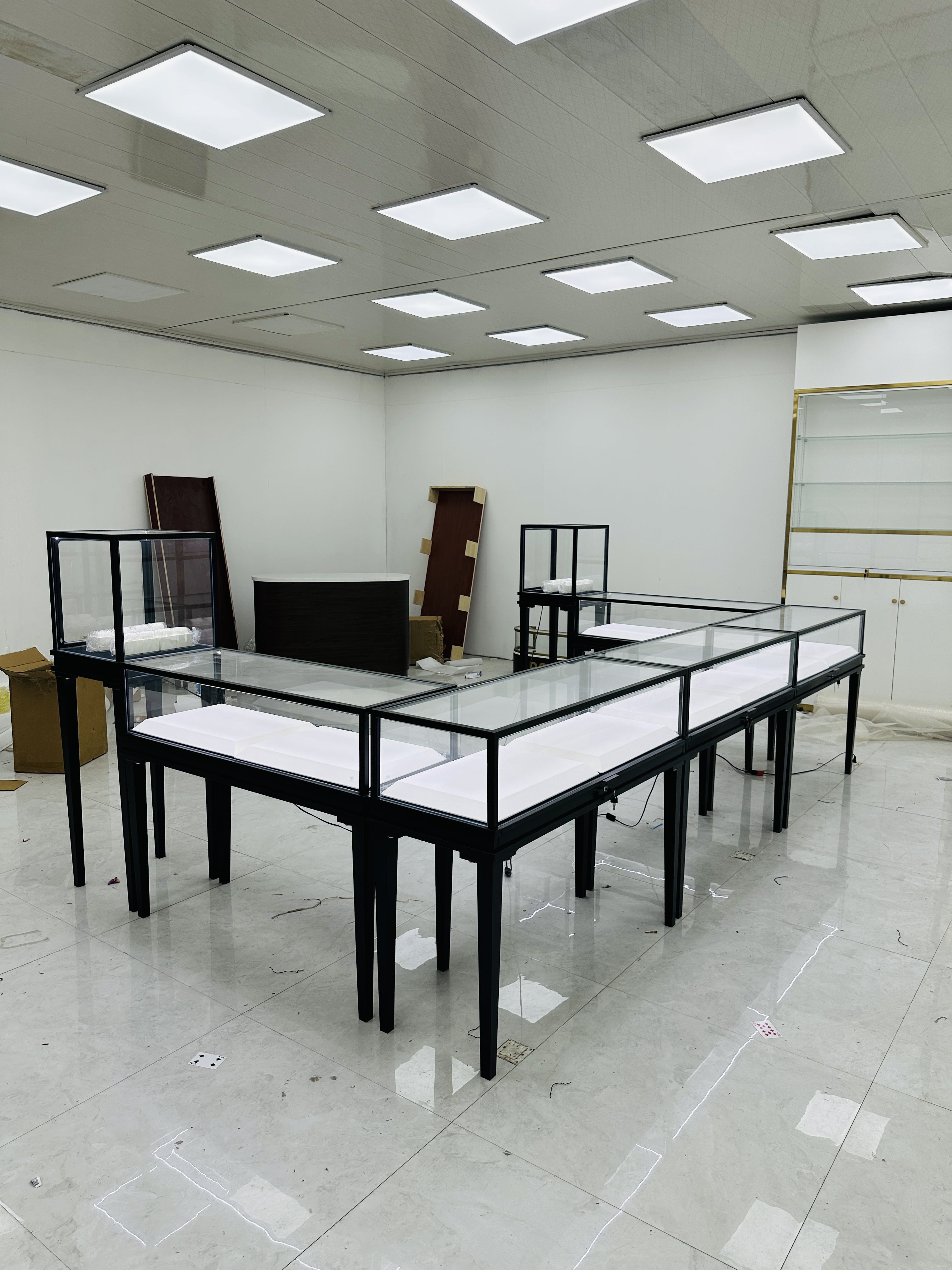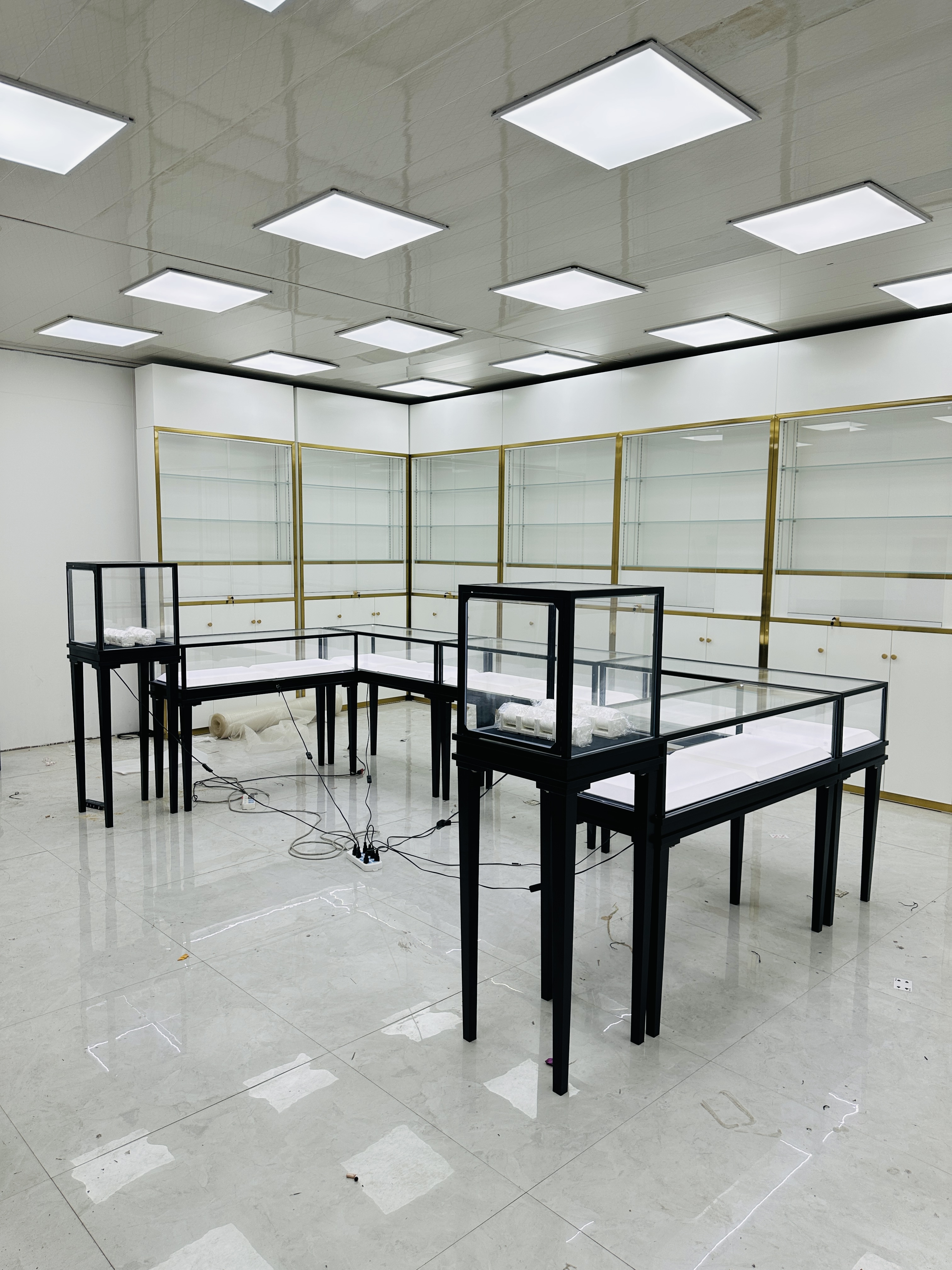 Это комбинация кабинета для розничной ювелирной актива, подходящая для магазина 6 м*7 м. Он состоит из передних и вертикальных шкафов. Передние шкафы измеряют L120*W55*H95CM, в то время как вертикальные шкафы измеряют L55*W55*H140cm. Он сделан с 8 -миллиметровым прозрачным закаленным стеклом, обеспечивая как безопасность, так и четкий вид на ювелирные изделия внутри. Интерьер покрыт черным бархатом, обеспечивая мягкий и роскошный фон, который усиливает красоту ювелирных изделий. Основание шкафа красное, добавляя оттенки цветового контраста. Кроме того, он предлагает большое место для хранения, что позволяет удобной организации предметов ювелирных изделий.