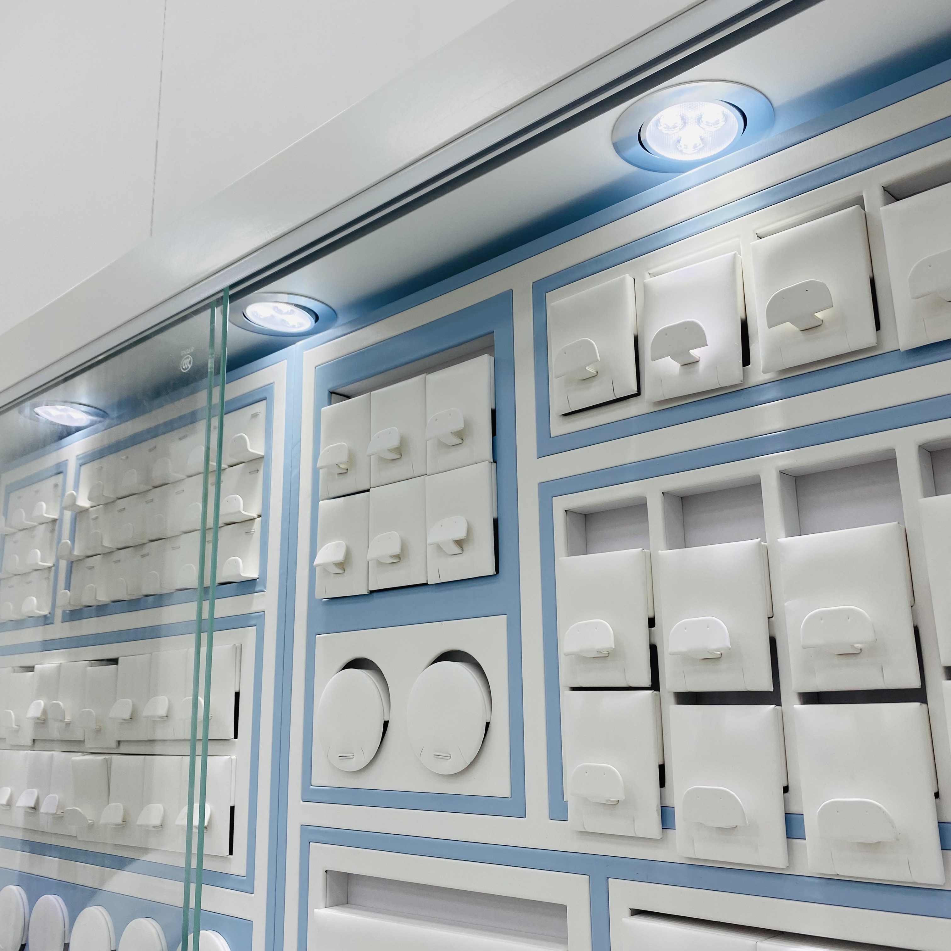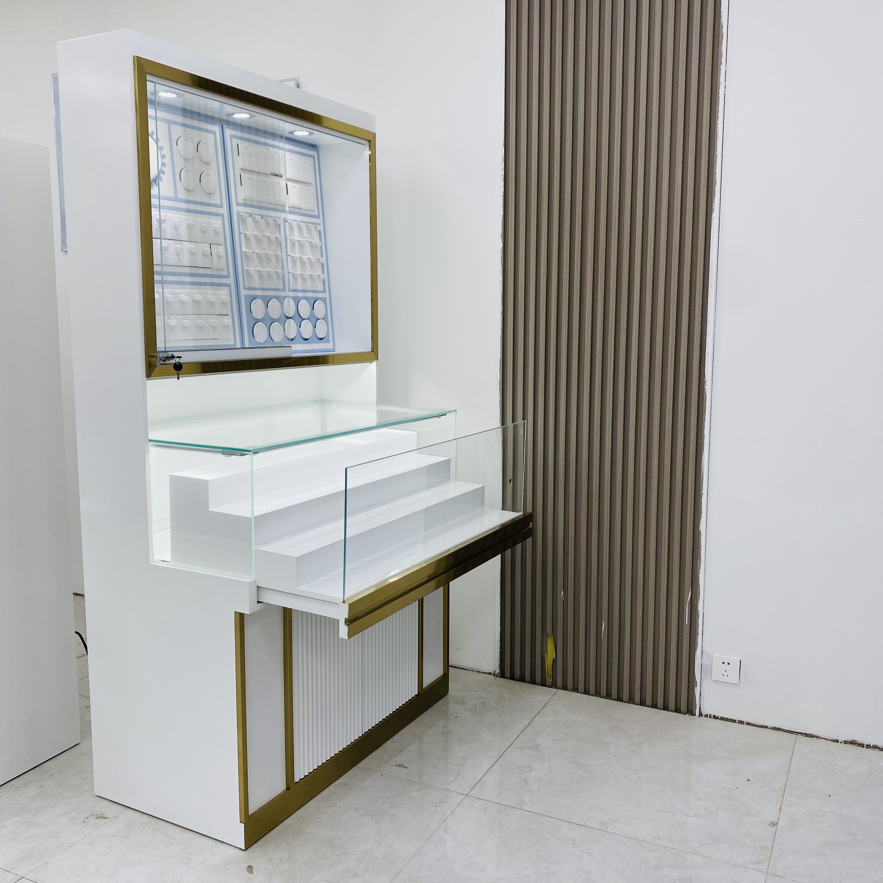Интерьер дисплея оснащен профессиональной системой освещения, такой как светодиодные полоски света или прожекторы, которые могут выделить блеск и детали ювелирных изделий и улучшить эффект дисплея. Система освещения также может быть отрегулирована в соответствии с характеристиками ювелирных изделий, и дисплей должен достичь наилучшего визуального эффекта.