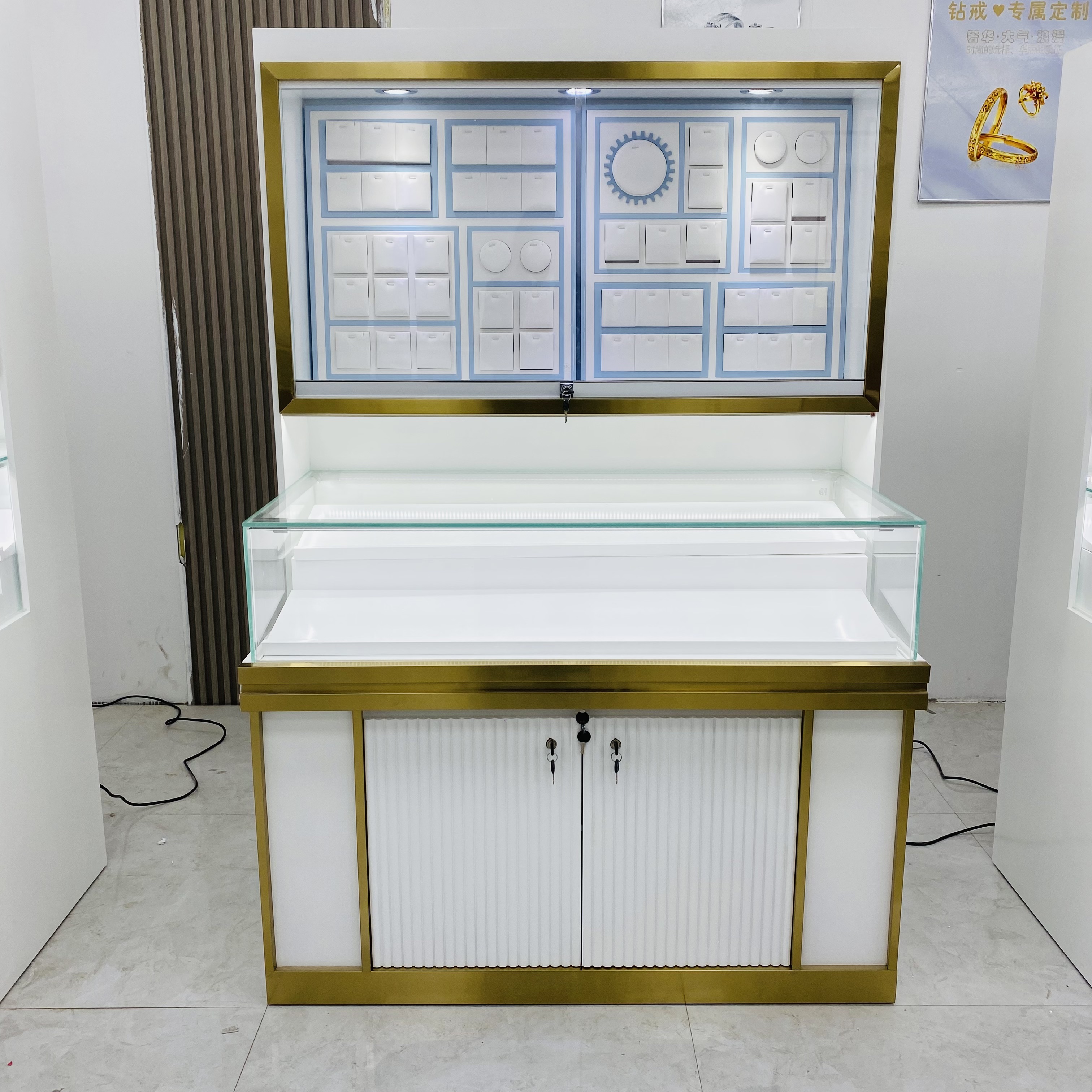 Элегантный шкаф из элегантного мастерства может быть настроен в соответствии с типом и количеством ювелирных изделий, в полном использовании пространства дисплея и повышения эффективности дисплея. В то же время, несколько слоев дисплея или ящики могут быть установлены внутри шкафа дисплея, чтобы облегчить классификацию и хранение ювелирных изделий.