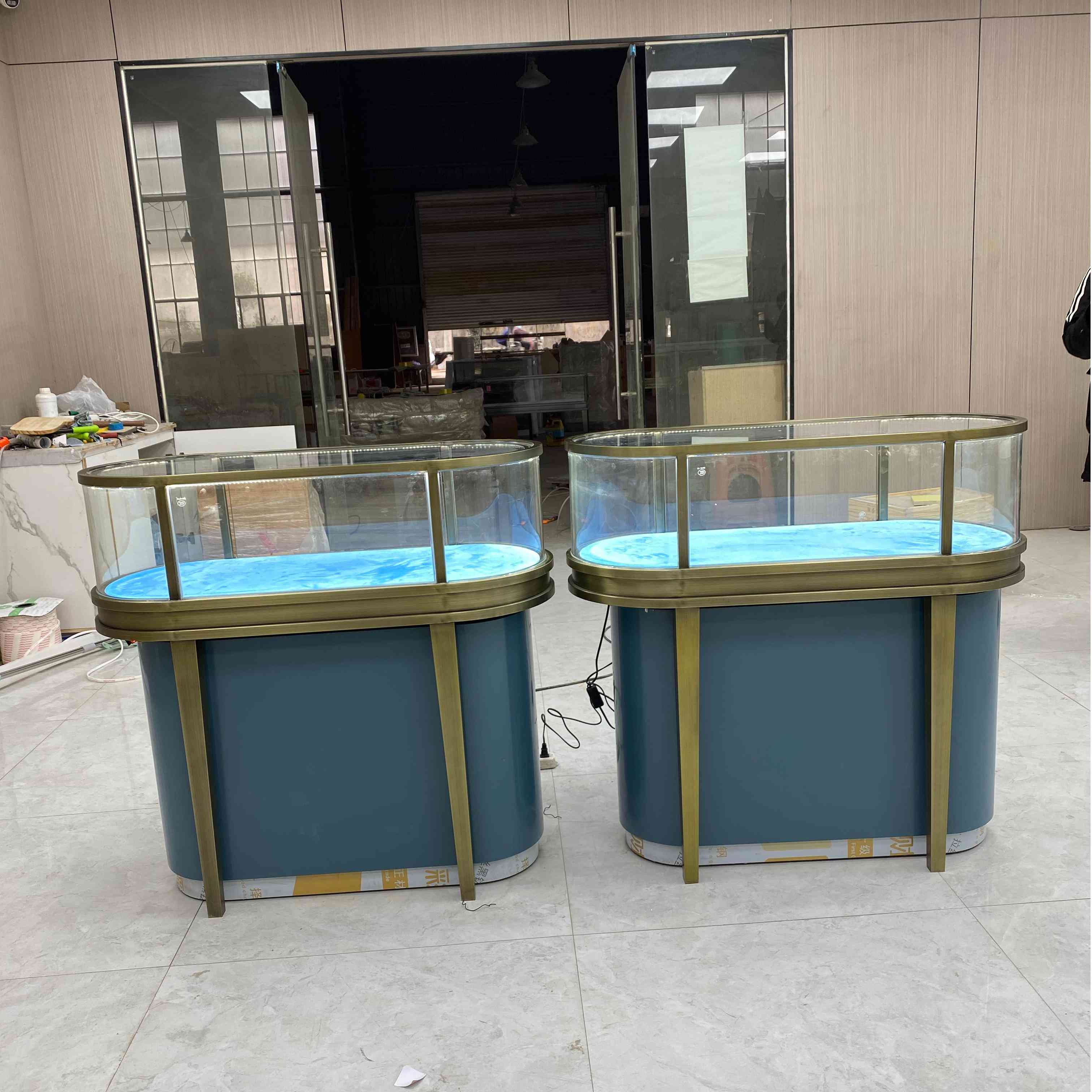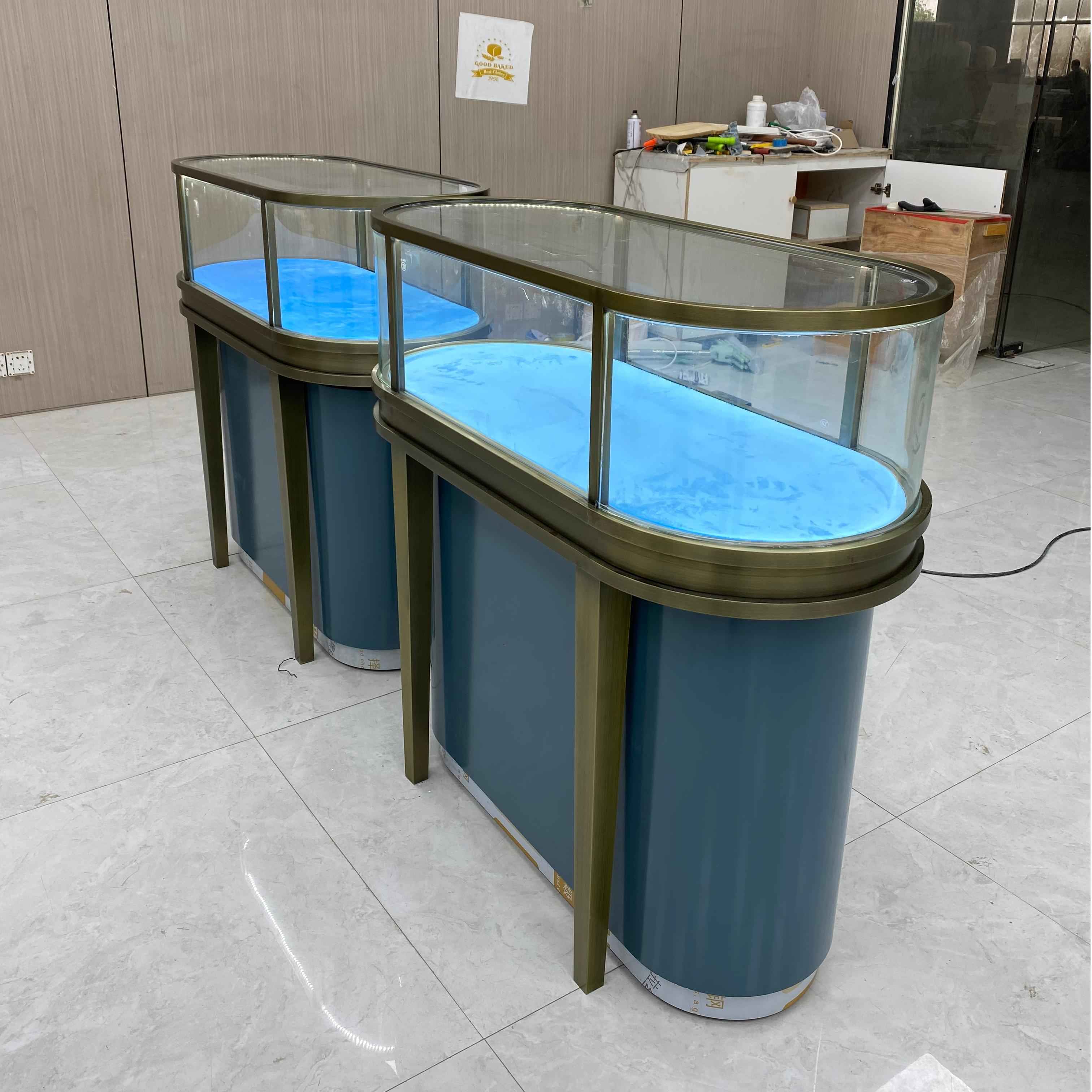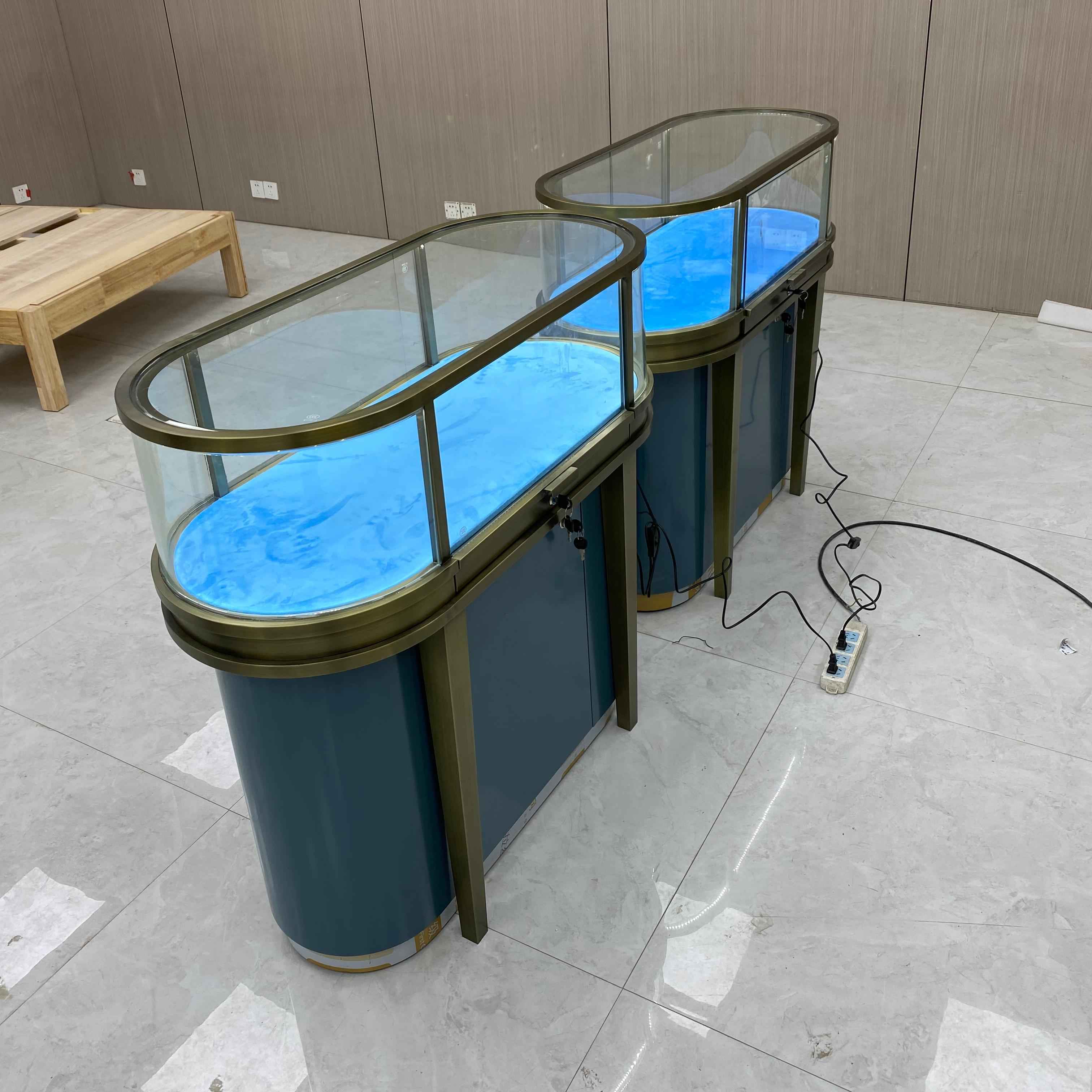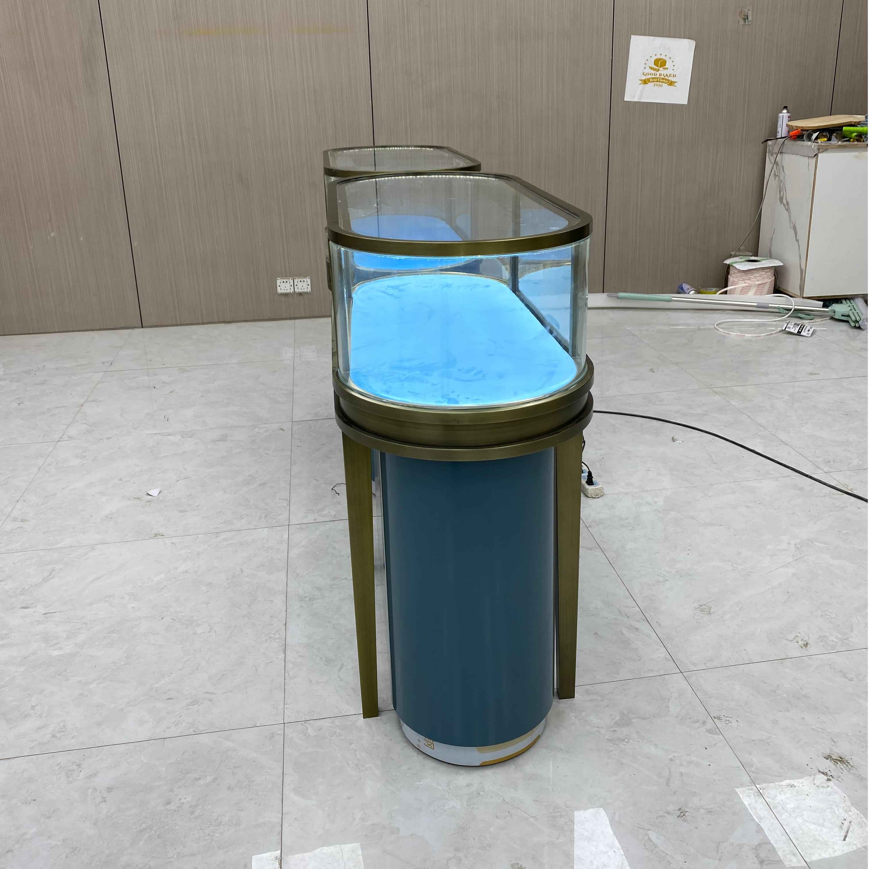 Это элегантный стеклянный шкаф. Размер - L120*W60*H95CM. Это имеет бронзовую раму нержавеющей стали с матовой отделкой, придавая ей изысканный и роскошный вид. Шкаф изготовлен из 8 -миллиметрового прозрачного закаленного стекла, которое является одновременно прочным и прозрачным, что позволяет хорошо вид на предметы внутри. Интерьер облицован синим бархатом, обеспечивая мягкий и элегантный фон. Основание шкафа также синяя, и включает в себя небольшое место для хранения, которое удобно для сохранения родственных предметов.